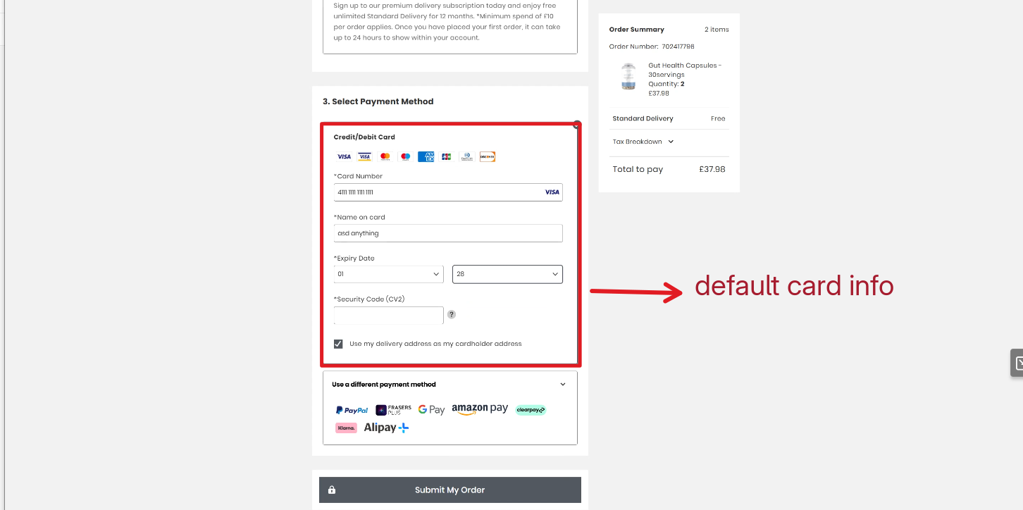 Lets dive into how i escalate checkout using default Visa card to account takeover First off, I stumbled upon something interesting: the system allowed the use of the default Visa test card (4111 1111 1111 1111) to complete orders in a production environment. and i can order any item for free! Great impact, right? But there were internal checks in place that would cancel the order after processing .