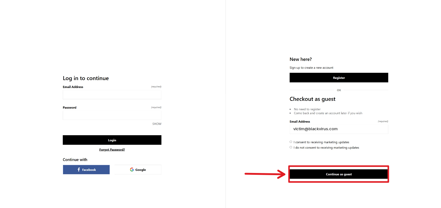 - Used the guest checkout with the victim’s email (victim@blackvirus.com)
